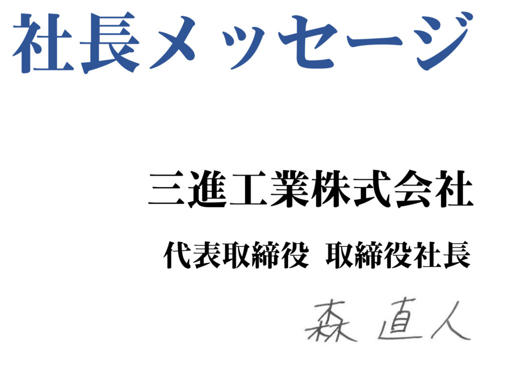 私たちは「前進、前進、また前進」を信条とし、「顧客重視と誠意」をモットーとする会社です。お客様に「安心の三進」と認めていただけるよう、日々、技術を磨く歩みを止めることはありません。お客様のために少しでも先へ、少しでも前へ、常に前進する会社です。